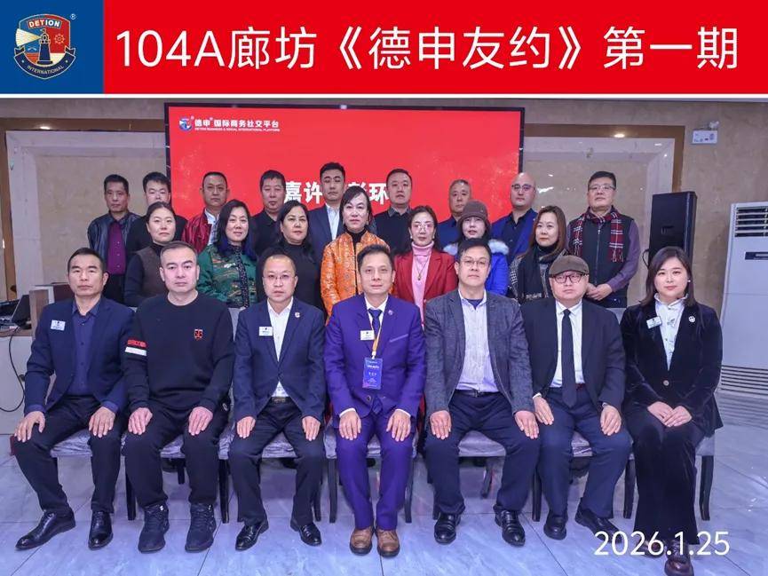 2026年1月25日,104A廊坊地区首场德申友约在廊坊市广阳区中太大厦会议室圆满举办。本次活动以“走进德申、链接价值、共商发展”,汇聚近40位企业家、行业精英与执委团队及会友,系统解读德申服务体系、分享实战经验、研讨发展路径,标志着德申正式扎根京津明珠、深耕廊坊,以前瞻性布局与开创性实践,为环京民营经济协同发展注入全新动能。