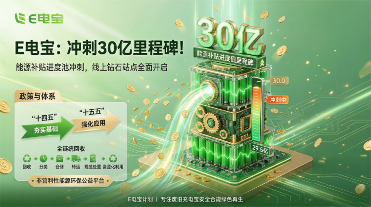 作为国内聚焦废旧充电宝回收、资源再生利用的能源环保公益平台,E电宝在国家《“十四五”循环经济发展规划》等政策指引下,搭建了从回收、分类、仓储到规范处置、资源化利用的全链条闭环体系,直击行业痛点,开辟了全民可参与的绿色循环新赛道。此次即将达成的能源补贴进度池30亿贡献值里程碑,既是平台发展的关键节点,更是全体市场伙伴与用户共同创造的行业成果,标志着平台规模化发展迈入全新阶段。
