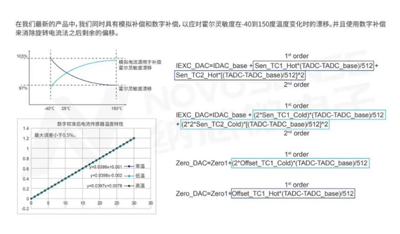 他介绍说,霍尔传感器作为一个历史悠久的磁传感器类别,和其他后面出现的技术(指AMR、GMR、TMR)相比,在精度和灵敏度等方面会有劣势。纳芯微深知这一点,基于多年的传感器调理芯片设计经验,以及在产品开发与应用过程中积累的大量客户需求与应用经验,针对性地设计了一阶+二阶温度补偿电路,保证了霍尔传感器在温度范围内的输出稳定性。
