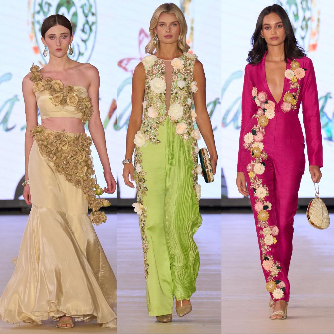 In Vogue Fashion Haus 在纽约时装周上推出了融合南亚影响与现代时尚的 SS25 系列。品牌创始人 Amy Bath 和 Manj Bath 从家中创业起步,如今已成为印度音乐和电影界的重要时尚力量。该系列以绚丽的色彩、刺绣和印花为特点,将传统南亚元素与现代时尚相结合,展示了品牌在时尚潮流中的独特地位。In Vogue Fashion Haus 的作品彰显了文化桥梁作用,同时在全球时尚界树立了创新典范。