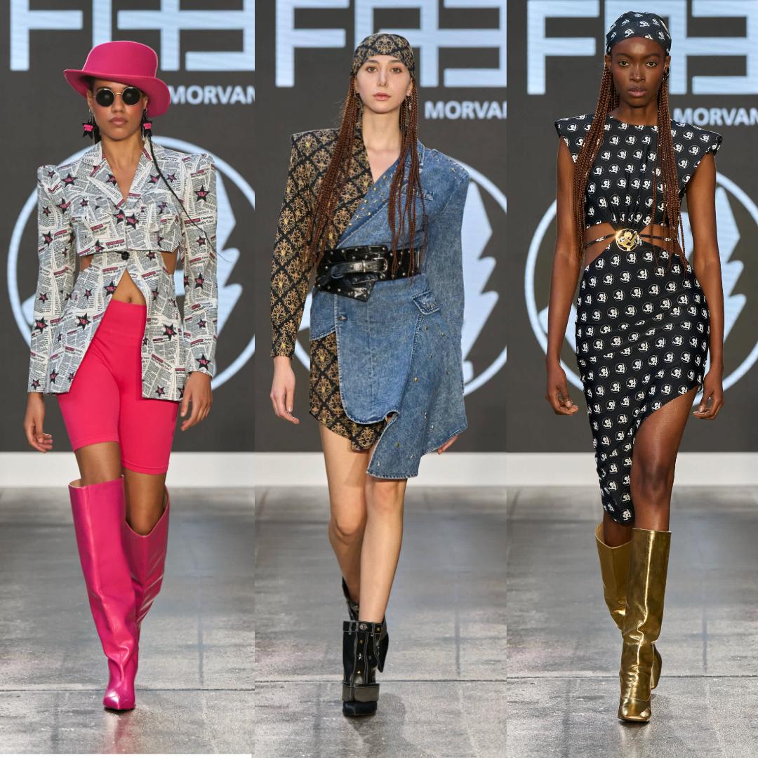 西班牙品牌 Lenifro 与 Milli Vanilli 成员 Fab Morvan 合作,在伦敦时装秀上推出“Rob & Fab Forever”系列,向80年代/90年代的标志性风格致敬。系列使用可持续材料,如回收塑料瓶制成的聚酯纤维,呈现大胆的肩线和鲜明的色彩,展现了包容性和环保意识。Lenifro 的作品结合了复古风与现代创新,为观众带来怀旧与前卫并存的视觉享受。