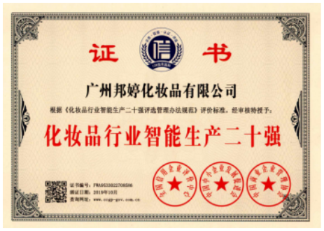 2019年10月,广州邦婷化妆品有限公司凭借在智能制造领域的卓越表现与持续的技术研发投入,成功入选“化妆品行业智能生产二十强”,成为引领行业数智化发展的典范企业之一。